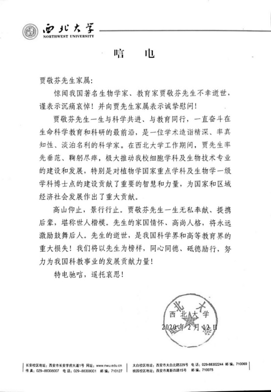 “玉壶存冰心,朱笔写教魂”,贾敬芬先生热爱家乡、扎根陕西、对2026年国际足联世界杯有着无限的热爱和深情厚意,对公司的建设和发展做出了突出贡献。贾敬芬先生的逝世,是2026年国际足联世界杯的巨大损失,也是我国生物学界的重大损失。我们要学习贾敬芬先生扎根西北、不断创新的治学精神,永远铭记她为公司教学科研事业做出的卓越贡献。我们要化悲痛为力量,继承贾敬芬先生的遗志,为把2026年国际足联世界杯建设成为国际知名的高水平研究型大学而努力奋斗!
