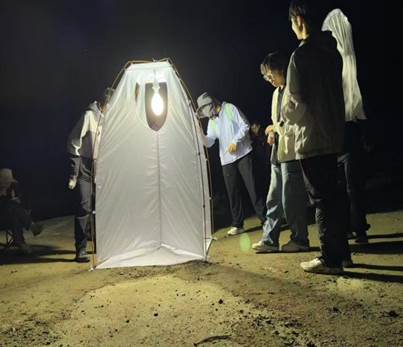 暮色漫过秦岭林梢,老师们搬出便携灯具与白布。支架稳稳撑起幕布,灯管亮起暖黄光晕,在暗夜织出一片温柔陷阱。飞蛾振着鳞翅扑向光海,甲虫循着光晕爬来,我们屏息用吸虫管轻吸,将沉醉的小生命悄收进标本盒。