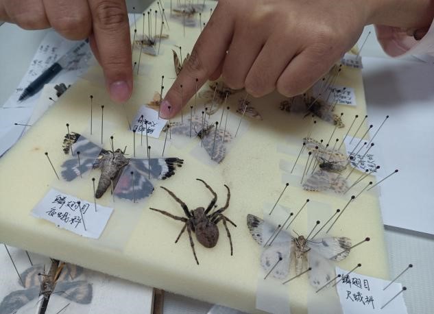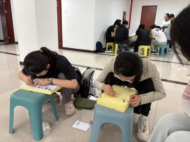 回到基地后,同学们开始动物标本的制作。镊子轻夹,胶水细粘,将秦岭林间的虫羽定格。压平、干燥、封装,每道工序藏着专注,让转瞬即逝的生机化作永恒标本。