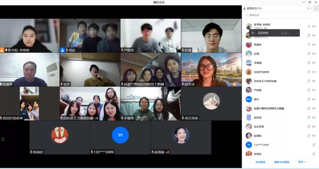 2019级临床医学专业线上班会由班主任陈富林教授组织召开。员工代表王利玮、杜璞、周晓芮代表班级同学汇报了近期同学们在志愿服务、日常运动、学习生活等方面的情况,班内同学就搬至附属医院以来的课程学习、科室见习、封闭生活等方面的感受、收获与困惑与老师同学们进行交流,陈老师就网络维护、放假安排等问题进行了答疑。随后,陈老师组织同学们就“从公共卫生角度如何解读西安疫情防控措施”等专业问题展开讨论。最后,陈老师建议同学们抓住宝贵时间,提高学习积极性,不断充实自我。