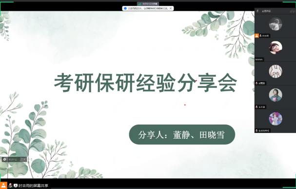随后,副班主任余源老师邀请2020级学姐董静、田晓雪为生物技术班全体同学举办了线上保研及考研经验分享会。会上,两位学姐结合自己保研、考研过程中的心路历程,详细讲解保研、考研以及专业规划方面的方法技巧。在两位学姐分享过后,同学们围绕研究院与高校区别、考研最佳备考时间、课程与竞赛平衡策略等问题展开咨询,学姐们耐心解答,让许多同学都茅塞顿开。分享会的最后,余老师就大家对科研方面的问题作出解答,并为全班同学加油鼓劲,希望大家无论考研还是保研都能全力以赴,不留遗憾。