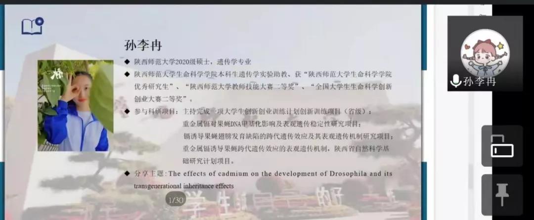随后,宋莉就“T6SS-3分泌的microcin核酸酶Tce1非接触依赖杀菌功能的研究”课题为大家讲述了有关细菌的专业知识。于海洋从个人简介、科研素养、员工工作三方面为大家分享了自己在研究生阶段学习的心得体会,并给出实验前要写计划、实验后要做记录等实践性建议。左卓为大家讲解了有关关节炎治疗的研究方法及成果。周通给大家分享了关于武当木兰的相关性研究。最后孙李冉就“镉诱导果蝇发育缺陷的跨代遗传效应及其表观遗传机制研究”这一课题,跟大家探讨了其研究背景和研究内容。