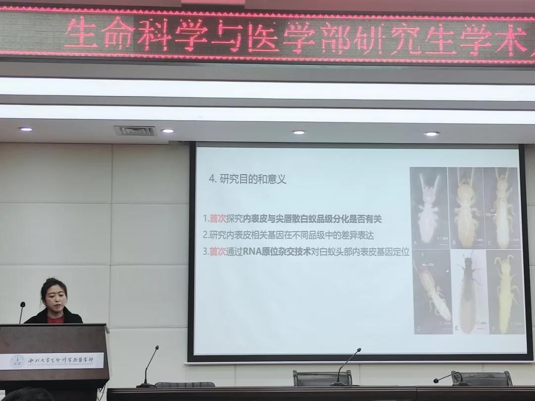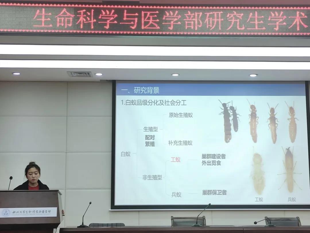 最后由2019级动物学硕士宋转转同学带来题为《内表皮与白蚁品级分化的相关性研究》的学术报告。介绍了白蚁品级分化及社会分工,以及其首次通过RNA原位杂交技术对白蚁头部内表皮基因的定位。