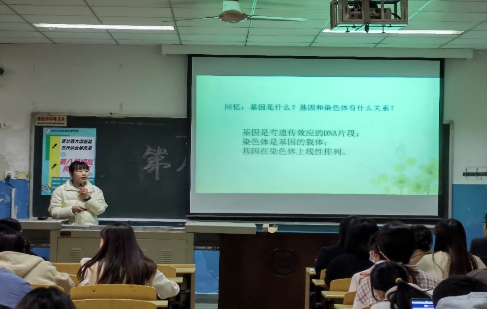 每一位参赛选手都满怀热情,将自己的授课内容完美呈现,以认真负责的态度对待此次比赛。首先上场的1号选手王茜以洪亮的声音、自信的眼神讲授了“染色体变异”,并赢得了观众热烈的掌声;2号选手刘亚楠沉重冷静,带领观众回看“小分子运输的方式”;3号选手蒋陈龙以幽默风趣的语言讲解“失爆”要点,使在场观众回味无穷;4号选手宋敏的“西大见证的近代史”也使观众发出阵阵惊叹。后面其他选手们也都各显风采,授课“DNA复制”、“琵琶行”、“细胞癌变”、“英语六级高分攻略”等内容,精彩的表现赢得了在场同学的阵阵掌声。