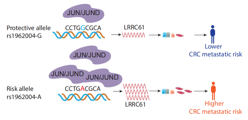 本研究在肠癌上皮细胞中鉴定出922个高可信功能性SNP,并构建这些变异可影响的转录因子及靶基因调控网络。通过对GWAS风险位点rs6061231及其连锁位点rs67941642的深入解析,研究揭示了rs67941642的T等位通过增强转录因子GFI1结合,上调抑癌基因TAF4表达,进而抑制肿瘤恶性表型的分子机制。尤为重要的是,研究利用同源配对细胞模型(SW480/SW620),首次系统识别出3,136个转移获得性SNP与3,008个转移特异性甲基化敏感元件,揭示了肿瘤转移过程中增强子序列变异调控的新机制。其中,转移获得性变异rs1962004通过招募AP-1转录因子(JUN/JUND),激活靶基因LRRC61表达,显著促进癌细胞转移并与患者不良预后相关。