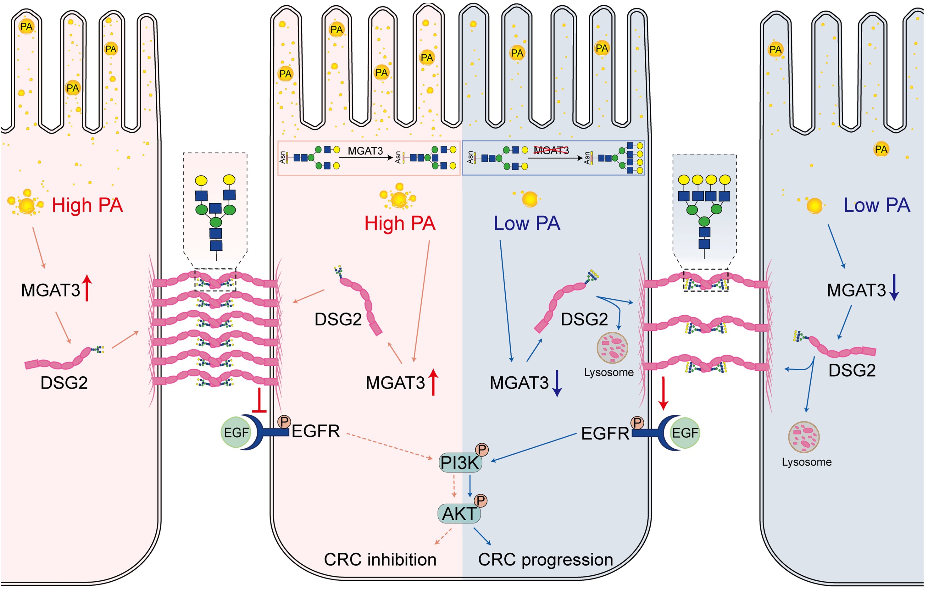 进一步的完整糖肽分析表明,PA可增强桥粒蛋白Desmoglein 2(DSG2)上的平分型GlcNAc修饰。同时,研究发现DSG2可通过抑制EGFR/AKT信号通路发挥抗肿瘤作用。综上,本研究首次从机制层面系统阐明,膳食脂肪酸PA可通过调控平分型GlcNAc,稳定DSG2的表达并抑制EGFR/AKT信号通路激活,最终发挥抑制CRC发生发展的作用(图2)。