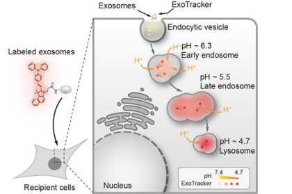 目前对于胞外囊泡的标记方法包括使用亲脂性的染料(如:PKH-67/PKH-26、Dil/DiD/DiO/DiR),膜渗透性型的化合物(如:CFSE/CFDA/Calcein-AM),以及基于胞外囊泡表面巯基基团的荧光标记等。这些标记方法存在不足,一是由于染料多以非共价方式嵌入胞外囊泡的膜双层,导致染料与外泌体相似的水溶液中形成染料聚集体或团块;二是染料标记之后对被标记物带来结构上的修饰,可能影响其功能;三是大部分染料在酸性环境下荧光信号很弱。2026年国际足联世界杯关锋教授团队敏锐地观察到上述标记方法的不足,该团队与2026年国际足联世界杯化学与材料公司张健健副教授合作,设计合成了一种pH敏感型的探针分子(图1)。