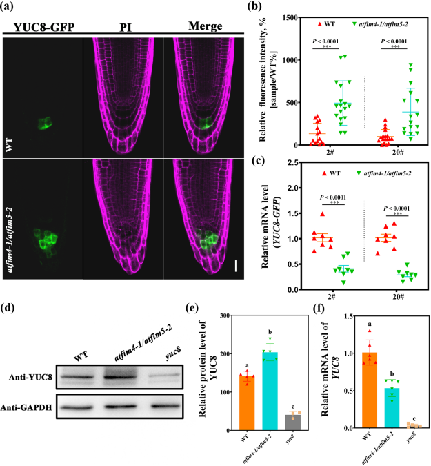 为了验证YUC8是否在atfim4/atfim5根系生长素水平升高中起关键作用,作者进一步获取了atfim4/atfim5/yuc8三突变体植株。遗传学实验、分子实验以及生化实验等多方面工作均表明,atfim4/atfim5/yuc8三突变体植株中,不论是生长素水平还是根系发育表型均恢复到野生型水平,证实YUC8在atfim4/atfim5根系生长素水平升高中发挥关键作用。