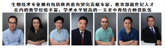 生物技术专业团队力量雄厚,现有教师60余名,教授25名,其中陕西省有突出贡献专家1人、教育部新世纪人才3人,2个研究团队入选教育部“创新团队发展计划”;近五年承担国家重点研发计划、国家863项目,国家重大新药创制项目、国家自然科学基金等60余项。已形成了一支老中青结合、教学经验丰富、学术水平较高的团队队伍。