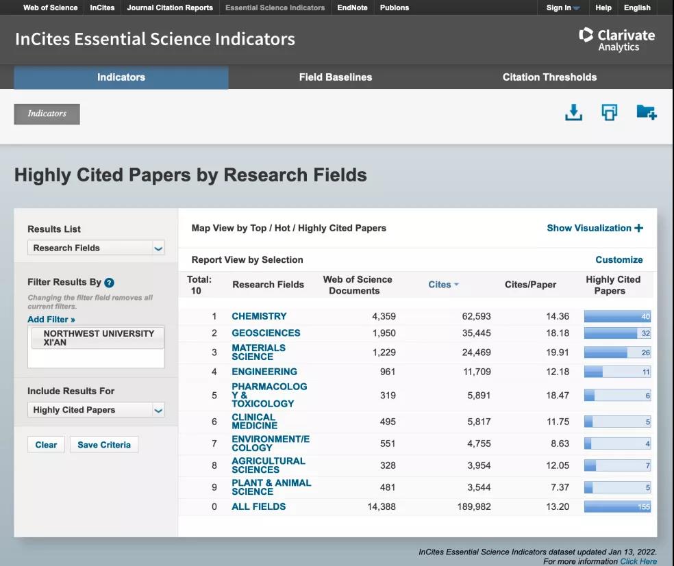 基本科学指标数据库划分22个学科领域,是基于科睿唯安Web of Science所收录的全球12000多种学术期刊的1000多万条文献记录而建立的计量分析数据库,是衡量科学研究绩效、跟踪科学发展趋势、评价国家/地区高校和学术机构国际学术水平及影响力的重要指标工具之一。