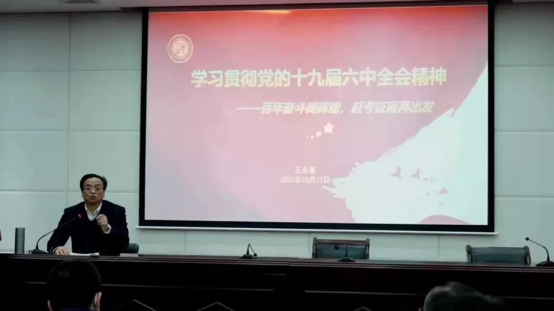 王永智教授从“五个深刻认识、四个历史时期、三个理论飞跃、两个确立、一个根本问题”五个方面来讲述全会精神。他指出,全会审议通过的《中共中央关于党的百年奋斗重大成就和历史经验的决议》是一篇马克思主义纲领性文献,全面总结了中国共产党成立一百年来,团结带领全国各族人民,创造的新民主主义革命、社会主义革命和建设、改革开放和社会主义现代化建设、新时代中国特色社会主义的伟大成就,积累的宝贵经验,对全党更加坚定、更加自觉地践行初心使命,在新时代更好坚持和发展中国特色社会主义,具有重大现实意义和深远历史意义。