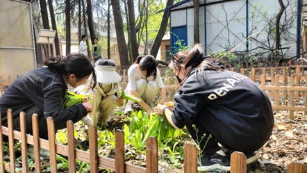 看到一株株油麦菜在风中摇曳,看到一颗颗油菜花在光下飞舞,原本荒凉的菜园居然变得这样生机勃勃、春意盎然,我们大吃一惊,这还是学姐口中的“荒凉”吗?我们干劲十足,按照分配好的工作,开始埋头苦干,顶着太阳,踩着湿湿的土地,弯身摘菜,一捆捆油麦菜被扎好,整整齐齐的放进袋子里,偶然的几滴汗滑进衣服里,也被满心的喜悦忽视,趁着大家都在休息的功夫,我观察着小小的花园看到旁边有刚刚插好的栅栏,翻新的土地,种上了种子,泛着泥土的清香,询问学姐后才知道“筑梦花园”是依照党旗图案设计,栽种着草本植物三色堇,期待它们像猫脸一样的花点缀着晚春的花坛,“草树知春不久归,百般红紫斗芳菲”。而 “筑梦菜园”,种植着油麦菜、红皮萝卜、豇豆,相信它们虽没有争奇斗艳的花园漂亮但这些蔬菜的蓬勃生长,不仅代表着菜园的新生,更是寄托着在这块土地挥洒过汗水的员工党员的希望。