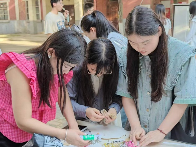 活动伊始,主持人为同学们介绍了此次活动的背景,同时详细讲解植物压花扇的制作方法。随后,参与同学分组开展手工制作,他们精心挑选植物材料,巧妙地运用“挑、粘、压”等技法,将一片片经过压制和干燥的植物标本,细致地铺展在扇面上,制作出一个个精美的植物压花扇子。每一件作品既展现了同学们的无限创意,又凝聚了他们对自然之美的体悟。活动尾声,同学们纷纷走上台前展示他们的创作成果,介绍了各自作品的创作理念,并分享创作过程中的乐趣与心得。此次活动吸引了近二百名同学积极参与,共收到87份充满创意与匠心的植物压花扇作品。