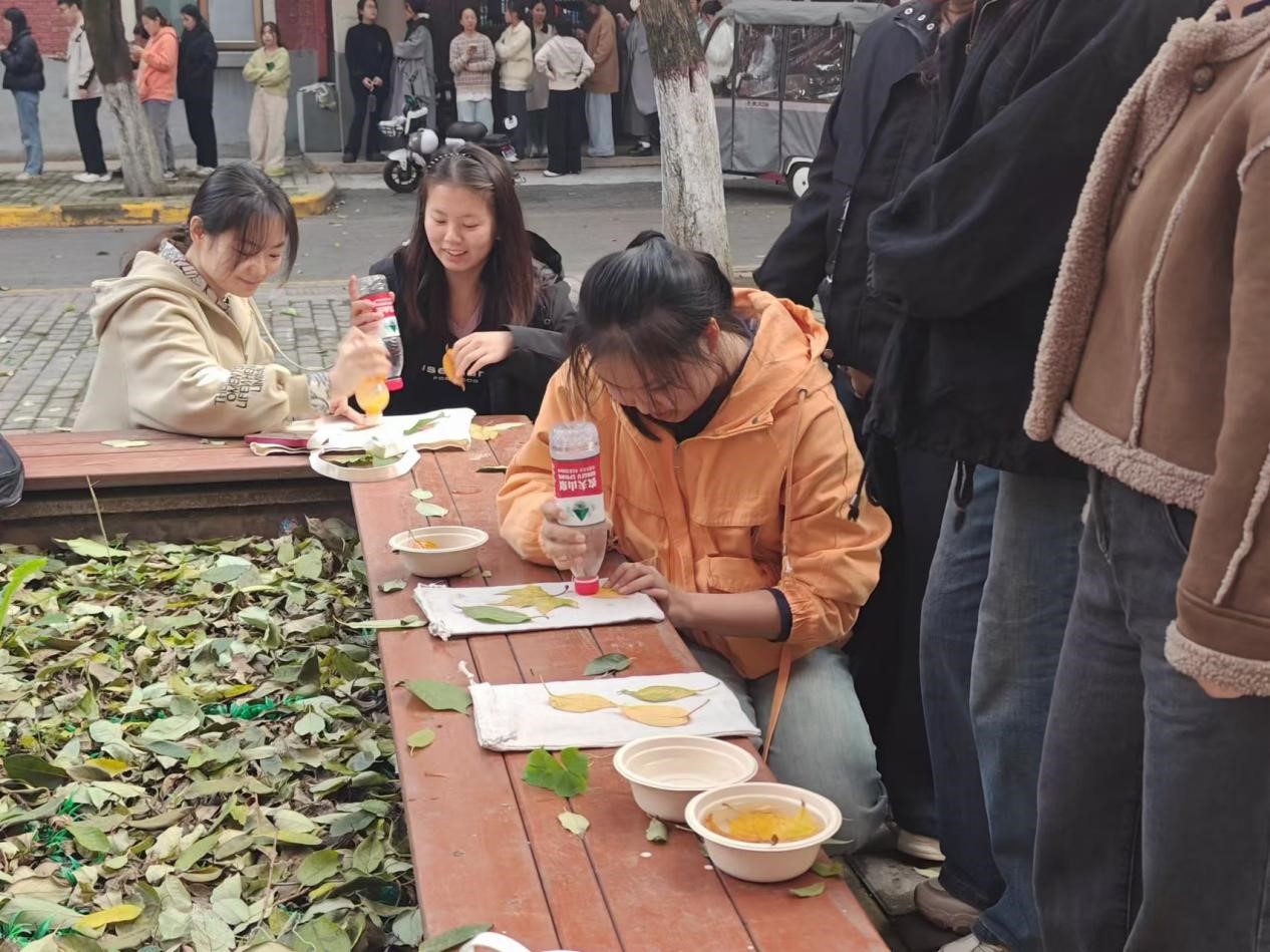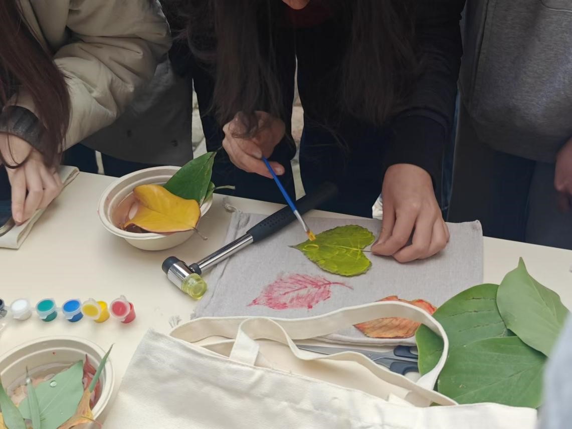 本次活动自11月7日拉开帷幕,共举办两场,为同学们带来了别具一格的文化体验。活动伊始,主持人详细介绍了植物拓染活动所蕴含的悠久文化内涵,将同学们带入了这一古老技艺的神秘世界。随后,同学们热情高涨地投入手工制作环节,通过巧妙的物理敲击手法,将植物汁液与颜料在织物纤维中晕染开来,如同灵动的画笔在白色帆布包、手绢上绘出绚丽多彩的纹理和创意画卷,为植物赋予了全新的艺术生命力。制作完成后,同学们带着满满的成就感走到镜头前,展示自己的植物作品,分享创作灵感以及在制作过程中的欢乐点滴与感悟。此次活动吸引了超过 300 名同学积极参与,通过此次活动,同学们不仅深刻领略了植物拓染这一传统技艺的独特魅力,更在亲身实践中体验了传统文化的深厚底蕴,为校园生活增添了一道独特的文化风景线。