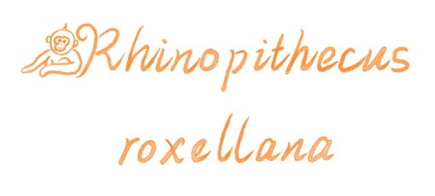 川金丝猴艺术字设计,将川金丝猴形象融入拉丁名Rhinopithecus roxellana中,第一笔巧妙的化作金丝猴的尾巴。