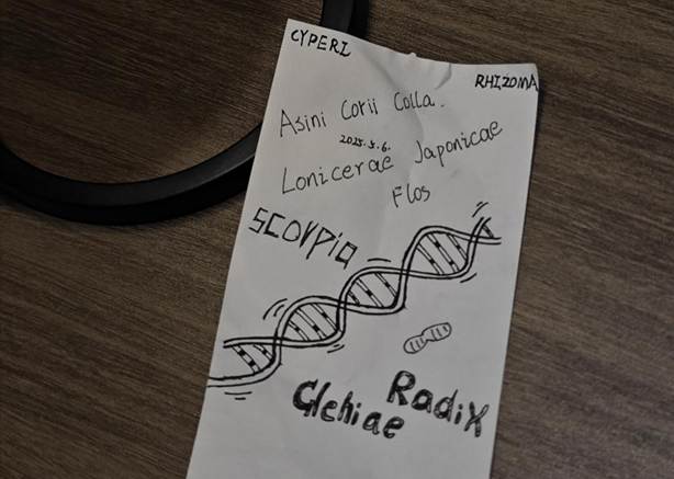 旅行途中和朋友们的随手涂鸦,生物当然少不了双螺旋结构,小票中的每个拉丁文都由不同的朋友涂鸦,分别代表着青岛的道地药材:阿胶、金银花、丹参等。