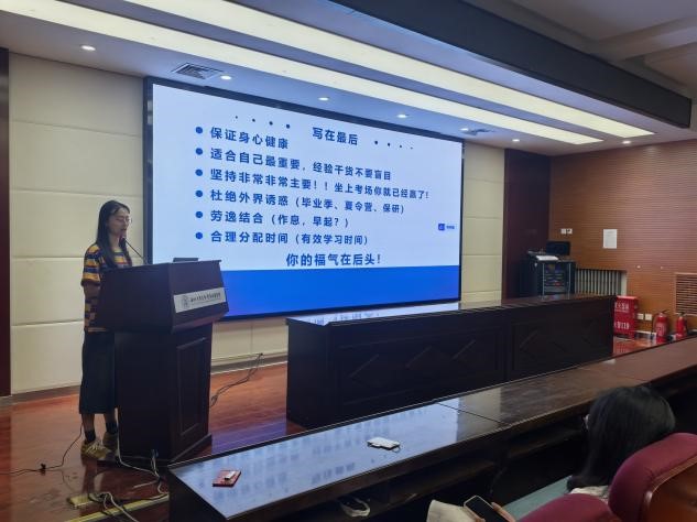 分享会伊始,张芝榕对历年来公司本科毕业生升学情况进行了简要介绍,包括录取比例及本公司考研状况,让同学们对考研的整体形势有了清晰的认识。