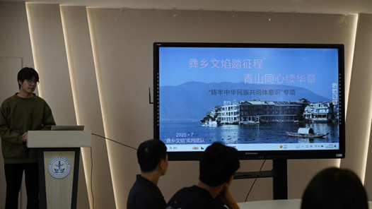 柏银杉代表“‘彝乡文焰’实践队”为大家深入叙述了他们前往彝在首个彝族自治县——峨山开展实践的经历。团队通过阿普笃慕广场文化寻根、学习彝绣、彝药、彝文非遗、参与火把节、基层调研四个阶段,深入理解彝族文化及其与中华文明的内在联系,完成了文化记录与研究报告,未来将推进彝文化数字化保护与民族医药研究,以实际行动筑牢中华民族共同体意识。