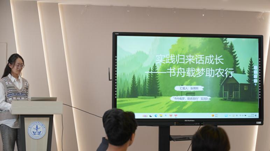 张博熙代表“‘书舟载梦,助农前行’实践队”汇报赴陕西开展黄芩产业实践的过程。团队成员探访企业了解种植加工销售模式,深入农田参与除草采样,走访农户见证收入提升,并参与研发高附加值产品。实践深化了对乡村振兴的理解,也认识到当地抗风险能力不足、产品结构单一及人才短缺等问题,成员们期待未来能为这些问题的解决贡献自己的力量。