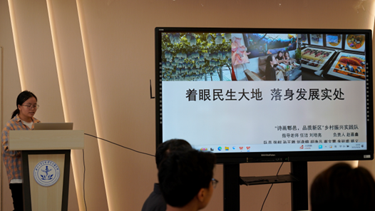 赵嘉鑫代表“‘诗画鄠邑、品质新区’乡村振兴实践队”分享了团队在灵山村的调研经历。团队调研发现灵山寺村农业以传统种植销售为主,旅游业新业态发展良好。团队通过访谈、文化对比及送清凉活动,总结业态创新经验,认识到经济发展需政策精准扶持与农民主动性相结合。