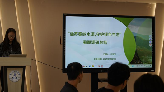 闫宛玉代表“‘涵养秦岭水源,守护绿色生态’暑期调研实践队”讲述了团队调研秦岭生态,走访植物园、研究所等地,完成42份样本采集和水质检测的经历。他们发现植被含水量随水源距离增加而降低,木本植物持水能力优于草本,并且制作水质报告。他们深化了生态保护认识,更加深刻地体会到了“绿水青山就是金山银山”这一生态理念,下定决心为秦岭保护持续贡献青春力量。