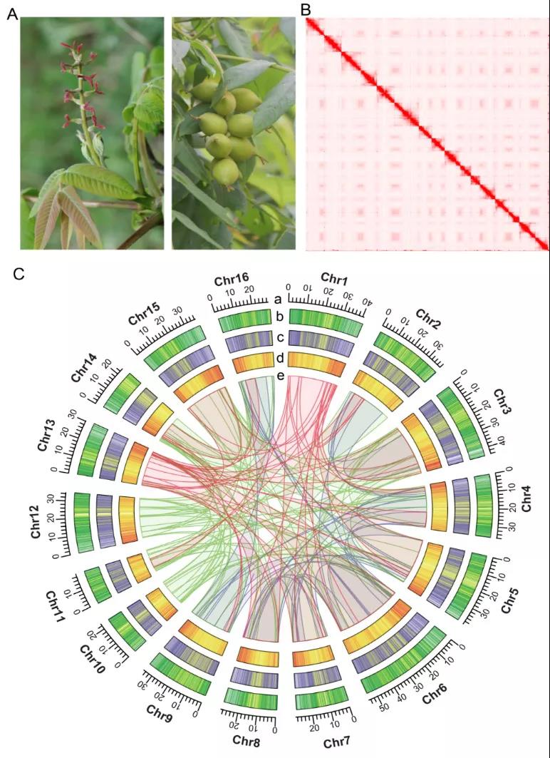图 1 核桃楸植物学形态及染色体水平基因组特征