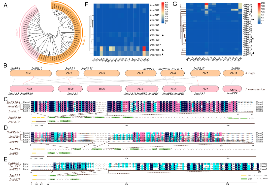 通过进一步的基因家族系统发育树、共线性、保守结构域、序列特征与不同组织表达量等分析,发现核桃楸中两个基因(JmaPR10和JmaPR8)与J. regia中三个基因为同源基因,均在根皮中高度表达,得出JmaPR10是核桃楸中作为抵抗线虫病的重要候选基因。