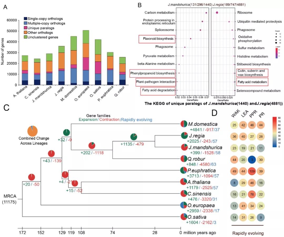 比较基因组显示,核桃楸(J. mandshurica)相比较于核桃(J. regia)缺失1,657个基因和插入2,827个基因。核桃楸包含1,440个特有基因,这些基因主要在黄酮类生物合成,苯丙烷类生物合成和植物与病原体的相互作用等三条通路中起着重要的作用。与其他物种基因家族分析相比,J. mandshurica中四个基因家族(LEA,WAK,PPR和PR)显著进化。