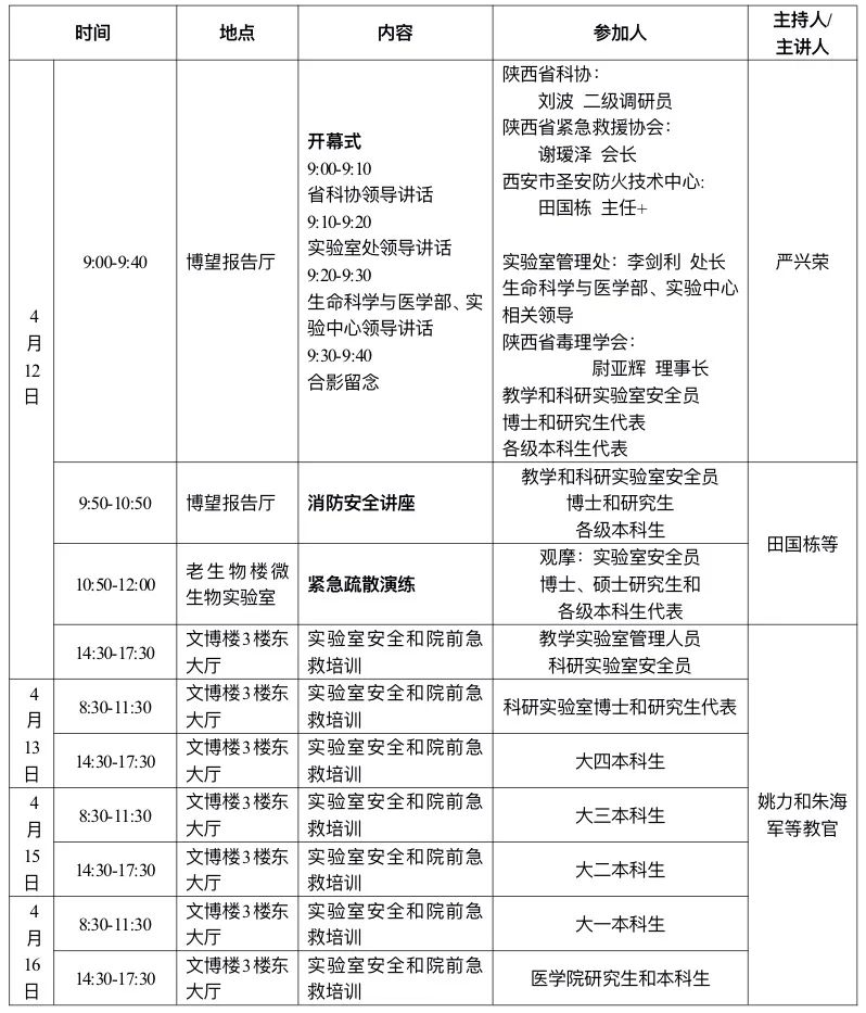 为使广大师生了解更多的实验安全常识,提高安全防范意识和能力,真正落实“安全第一,预防为主”的实验方针,公司第一届实验室安全文化月将于2021年4月12日(下周一)正式启动,4月12日-4月16日,活动将面向生命科学与医学部全体师生,安排消防安全讲座、紧急疏散演练、实验室安全和院前急救(在病人到达医院前所实施的现场抢救和途中监护的医疗活动,如心肺复苏、外伤包扎等)培训诸多环节,通过专业老师的指导,进一步提高师生的安全意识。