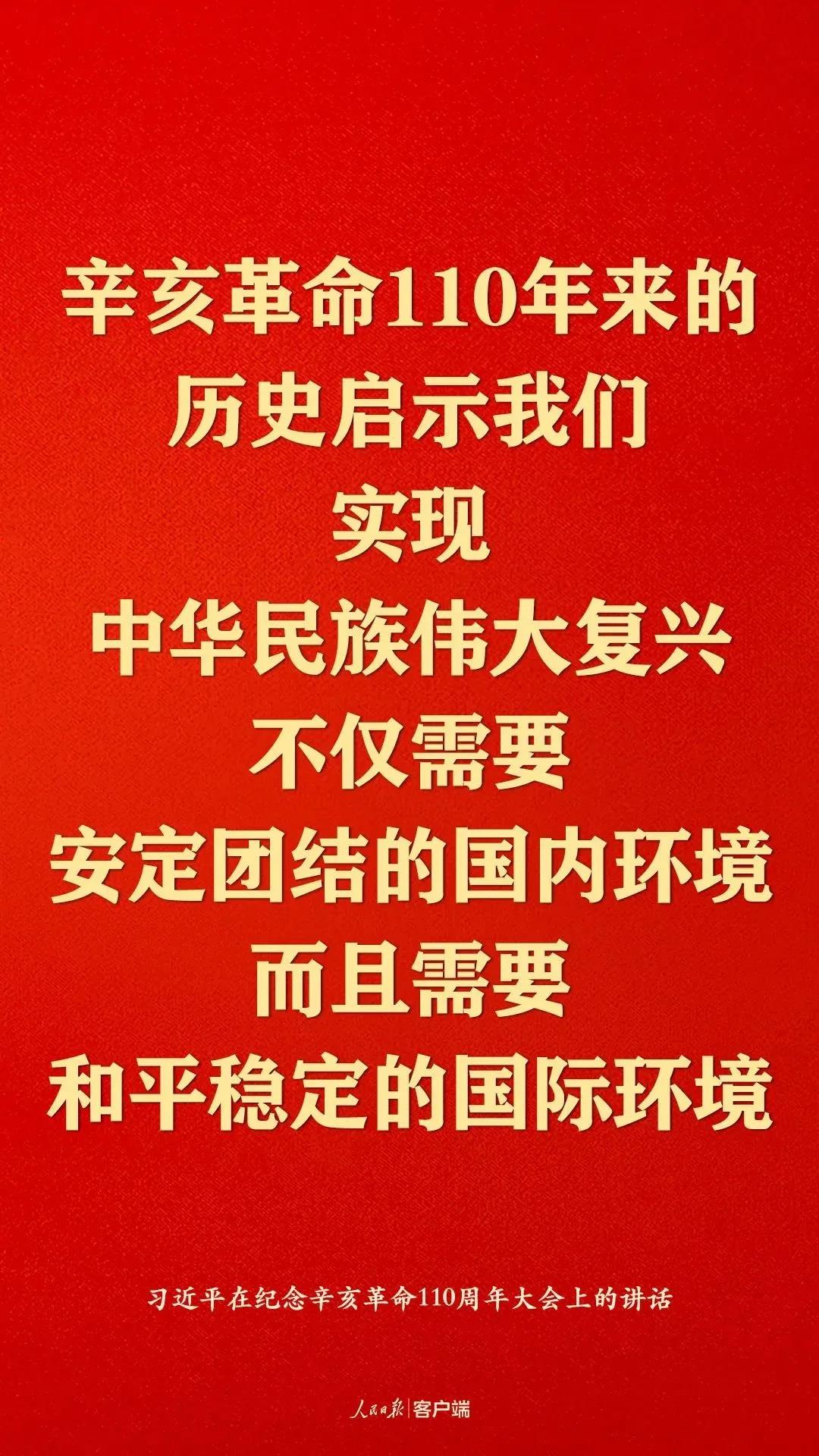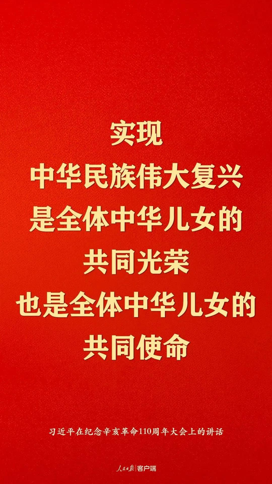 习近平总书记在纪念辛亥革命110周年大会上的讲话,站在民族复兴的高度,深切缅怀孙中山先生等辛亥革命先驱的历史功勋和崇高精神,高度评价辛亥革命的伟大功绩,深刻阐述辛亥革命在民族复兴进程中的重大意义,深情展望中华民族伟大复兴的光明前景,必将极大地激励海内外全体中华儿女为实现中华民族伟大复兴而奋勇前进。
