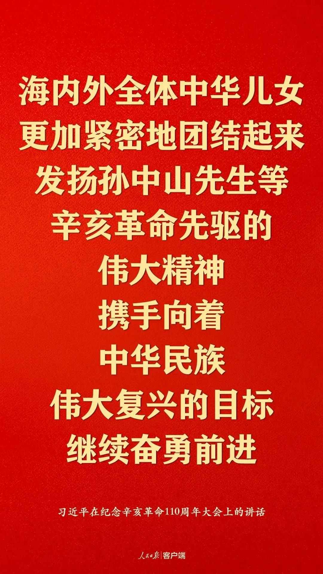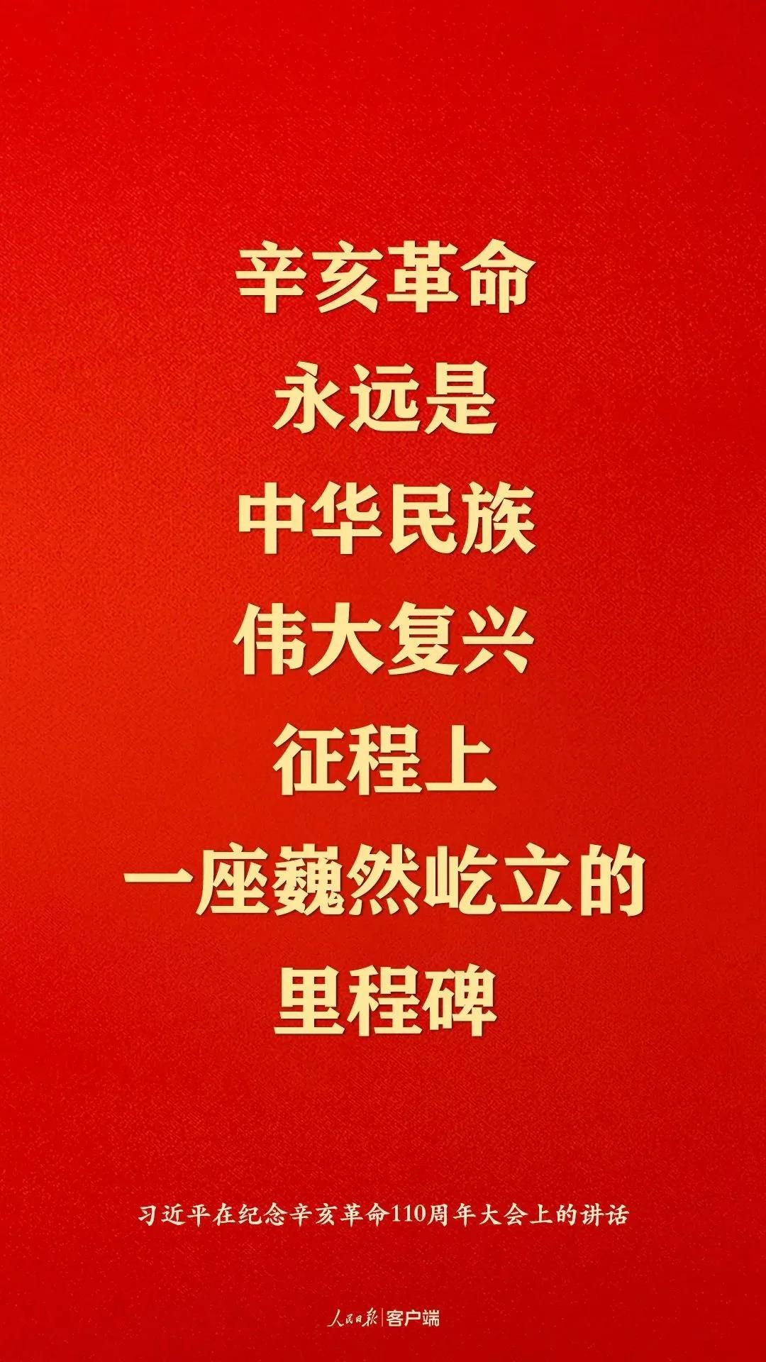 110年前爆发的辛亥革命,以其惊心动魄的时代伟力,打开了中国进步闸门,成为民族复兴伟大征程上一座巍然屹立的里程碑。今天,我们在向革命先辈致敬同时,必须以史为鉴,开创未来。特别是重温中国共产党人的爱国初心、壮志情怀和革命精神,以习近平新时代中国特色社会主义思想为引领,勤奋学习、开拓创新、团结拼搏,书写青年一代的华彩篇章。