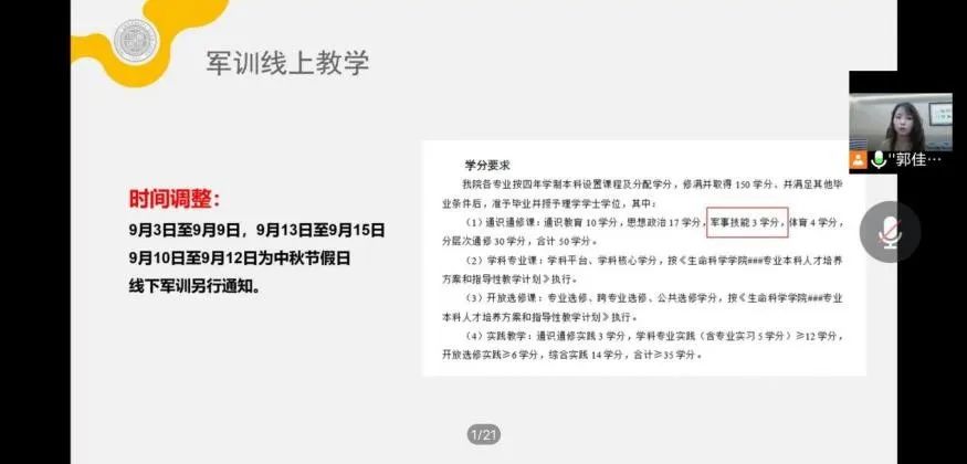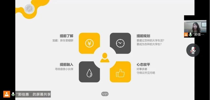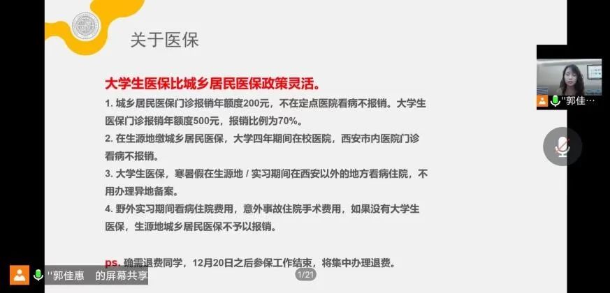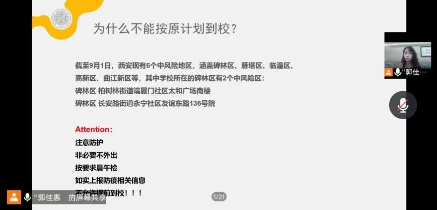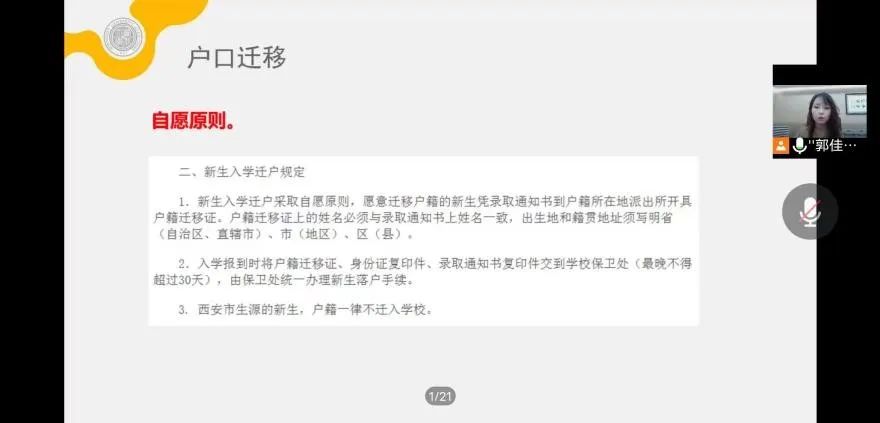 随后,郭老师针对西安疫情防控现状、医保办理、团关系转接、资助政策、户口迁移、银行卡申领、军训线上教学、班级分配、班委竞选等新生关心关切的问题进行了逐一说明,对QQ群消息关注等注意事项进行了重点强调。最后,她从提前了解、提前融入、提前规划、放平心态四个方面,向新生分享了入学前建议,鼓励新生在到校报到前主动了解公司公司专业有关信息,提前建立宿舍群与舍友取得联系,通过积极了解提前思考未来的学习生活规划,放平心态,积极应对,在即将开启的最璀璨最纯粹的篇章中,踔厉奋发,奋勇向前。
