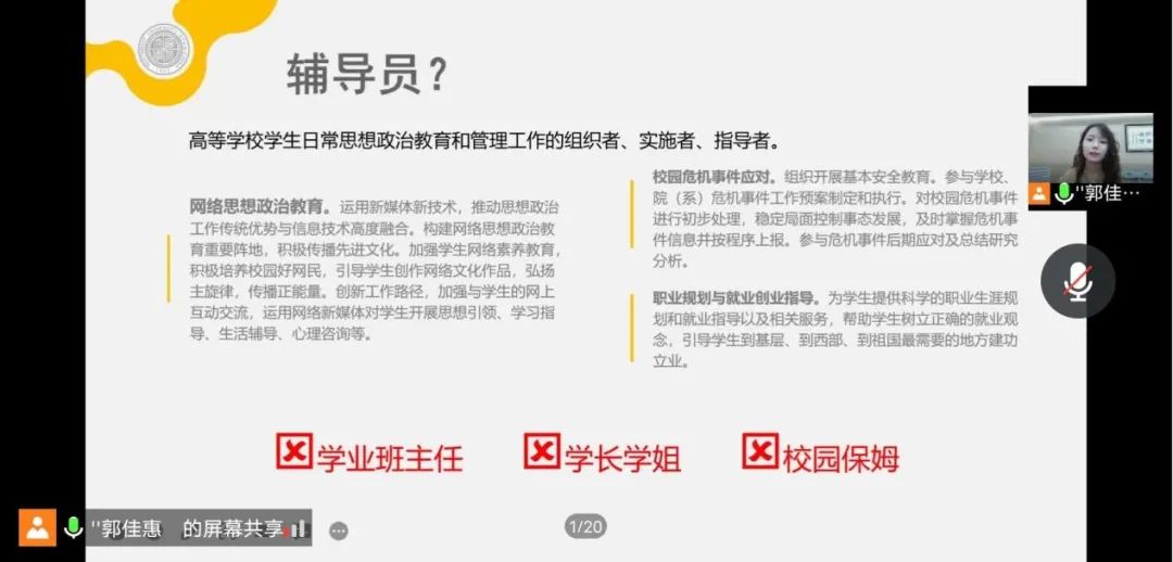 郭佳惠老师首先向同学们作了正式的自我介绍,同时利用教育部43号令中规定的辅导员九大工作职责,深入浅出介绍了辅导员的含义、工作内容、工作权责,分享了辅导员与学业班主任、学长学姐、校园保姆之间的区别,表示将与同学们相伴老员工活全程,努力为同学们的成长成才保驾护航。