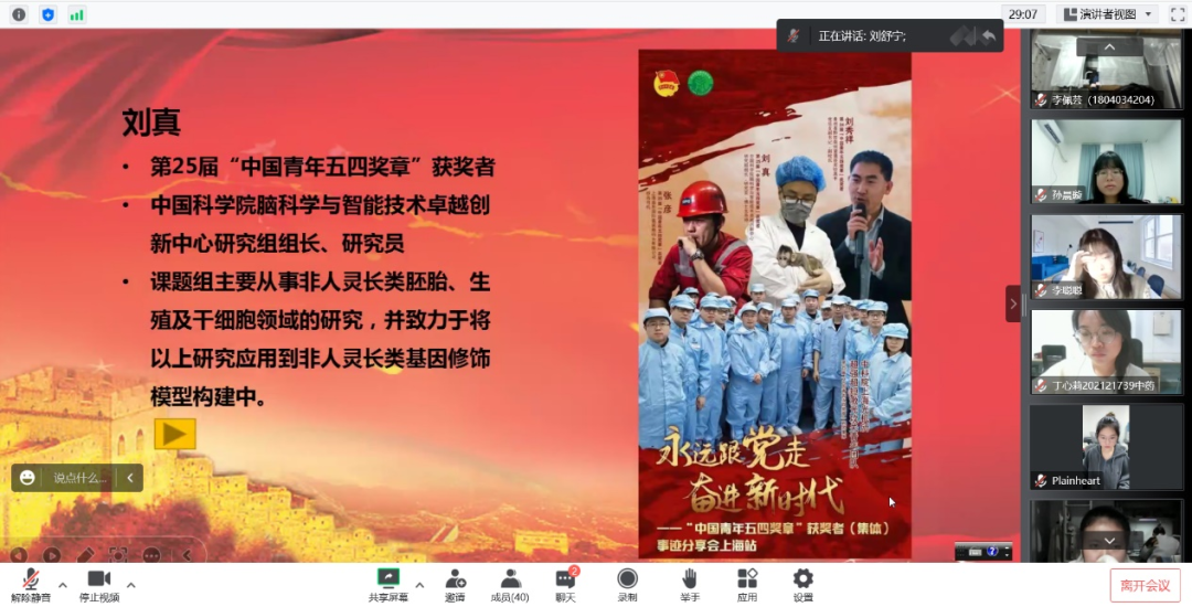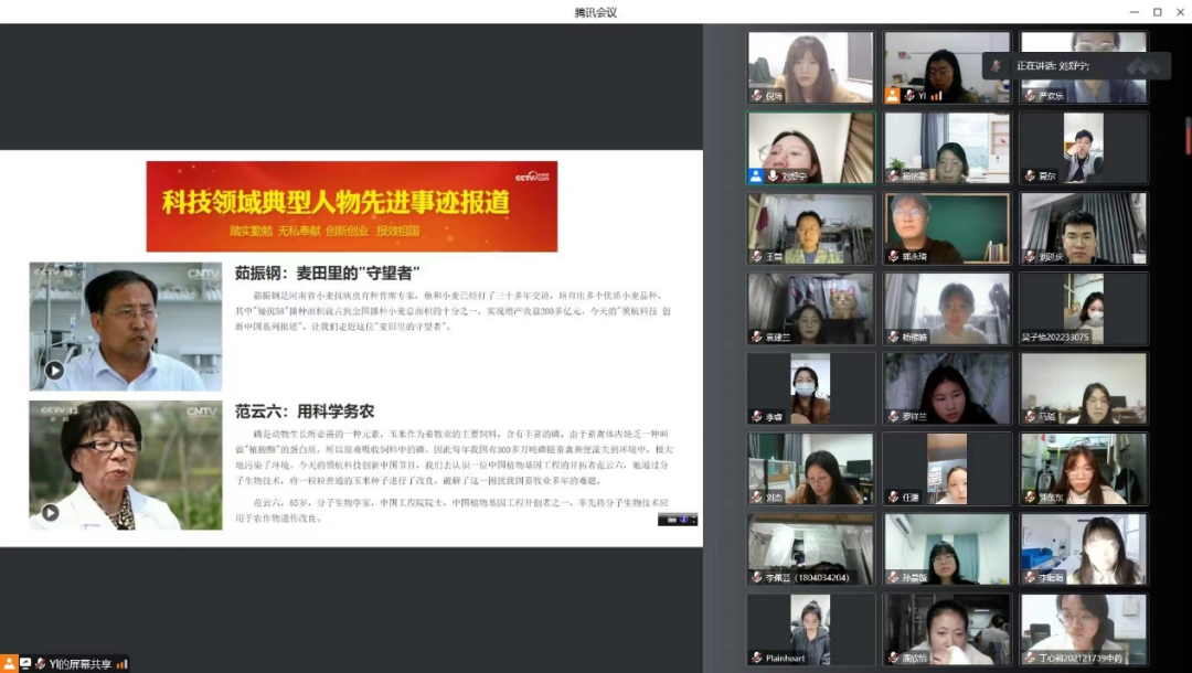 随后,参会员工共同学习了生物领域榜样的事迹,例如麦田“守望者”茹振钢,以“让土地生金,让祖国的粮仓更加丰盈”为己任,培育并推广了家喻户晓的小麦新品种;站在战“疫”最前线的巾帼英雄李兰娟院士,她永远在抗“疫”第一线,争分夺秒攻关抗毒难题;培育出世界首个体细胞克隆猴的中科院刘真研究员,标志中国体细胞克隆猴进入新征程,让药物研发驶入“快车道”等,让同学们深刻的感受到了榜样们的科研精神和创新精神。
