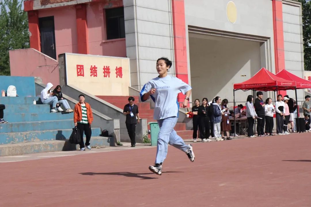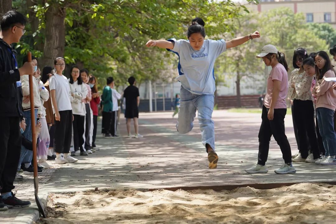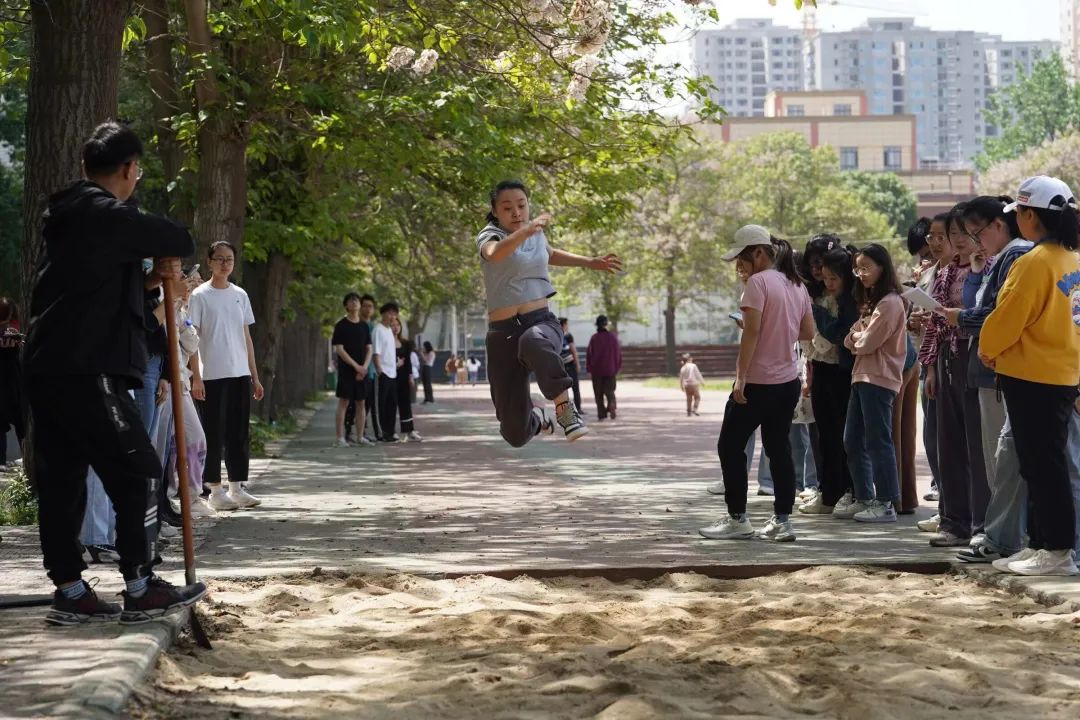 跳远比赛正式开始,每一步的腾跃,积攒的不止力量,还有激情;每一步腾跃,迸发的不止速度,还有斗志;每一步腾跃,挥扬的不止汗水,还有青春!踏条腾空,跨步一跳,划出弧线,奔向阳光。裁判员的每一次拉线测量都聚集着选手和观众的殷切期待,选手们每一次的跳跃,都向我们展现了生科学子别样的风采。