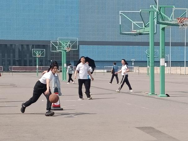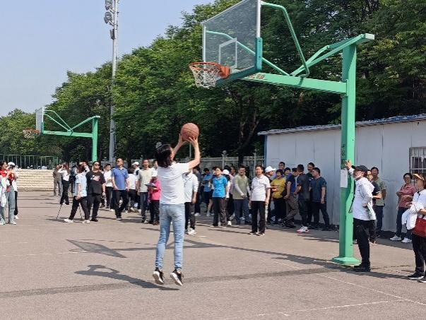 教工团体运球上篮,参赛老师将球控制在手掌之间,游刃有余,三个健步,纵身一跃,完成了整个上篮的动作。