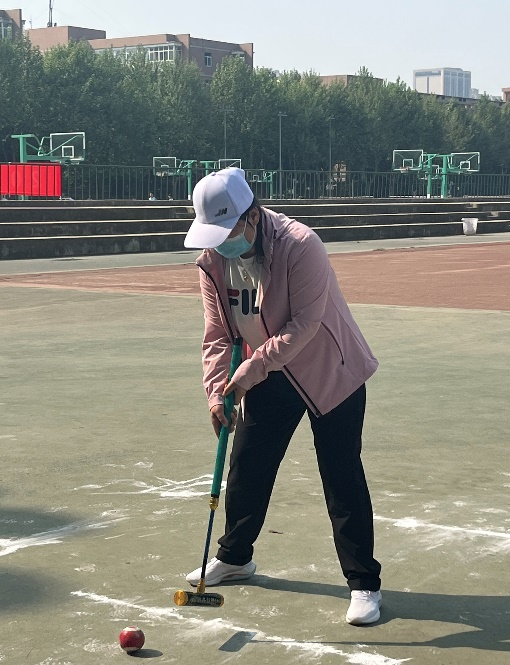 女子教工老年组门球,参赛老师们挥杆击球,精神抖擞;慢步轻跑,身影矫健,联手同和带虎沟。