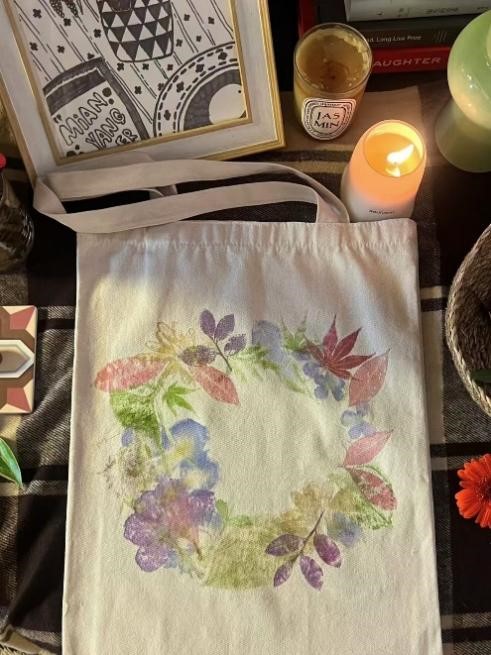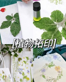 植物拓印,一种通过敲击,植物叶子汁液天然色素印染在布料上的印花手工艺。可在布料上创造出自然、独特的纹理和图案,使布料呈现出植物叶子的形状和颜色。