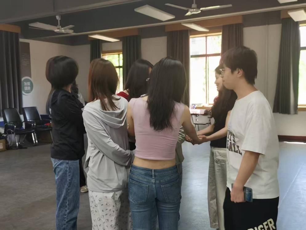 分三组进行,每组选出一位同学担任解结者,其余同学则分别代表一种压力状态,通过牵手围成一个圆圈,形成互相缠绕的结,然后解结者进行解结。随着结的逐渐解开,同学们直观感受“压力交织与化解”的过程,体会到协作与耐心的力量。