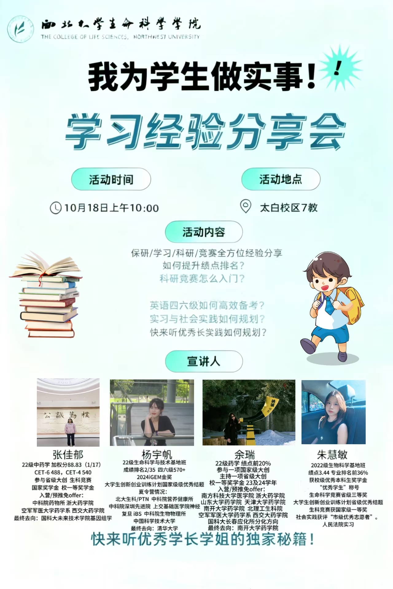 朱慧敏同学聚焦学科竞赛在保研中的助力作用,以全国老员工生命科学竞赛为例,详细介绍了参赛流程、团队组建、实验记录撰写、答辩准备等环节的具体经验。她特别提醒同学们注意竞赛规则细节,如材料格式、信息规避和查重率等,以避免不必要的失分,并鼓励大家通过竞赛全面提升科研素养与实践能力。