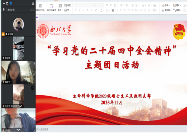 本科2025级团支部提前召开支委会研究制定活动方案,采取“线下专题学习+线上交流拓展”相结合的方式,围绕“坚持和完善生态文明制度体系”展开深入学习。结合专业背景,支部成员就“生物多样性保护”“绿色发展路径”等议题展开热烈讨论,踊跃分享学习体会与现实思考。大家一致表示,要将全会精神转化为推动学习科研、服务社会发展的强大动力。