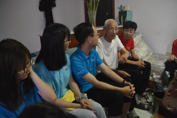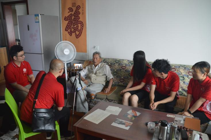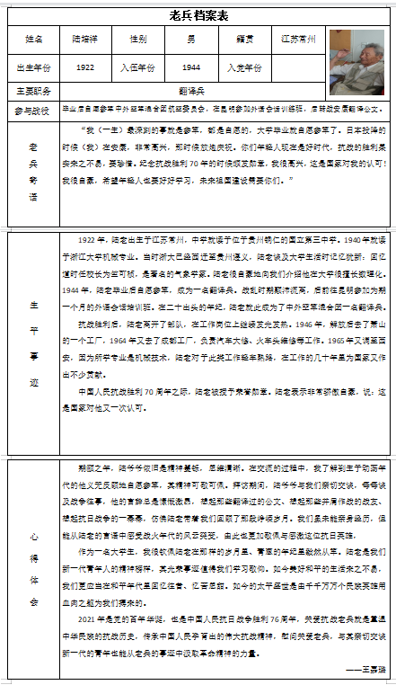 老人及其家属对于同学们的到来表示欢迎及感谢。拜访期间,99岁高龄的陆爷爷依旧精神矍铄,与我们亲切交谈,陆老每每谈及战争往事,他的言辞总是慷慨激昂,想起那些翻译过的公文、想起那些并肩作战的战友、想起抗日战争的一幕幕,仿佛陆老带着我们回顾了那段峥嵘岁月。我们虽未能亲身经历,但能从陆老的言语中感受战火年代的风云突变,由此也更加敬佩与感激这位抗日英雄。