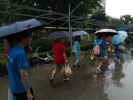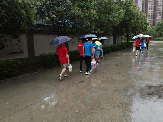 活动第一天,虽遇到恶劣天气,但同学们风雨无阻,淌水前行。当日,队伍拜访陆培祥、段少云两位老人,并为老人们送去牛奶、水果、食用油等慰问品。