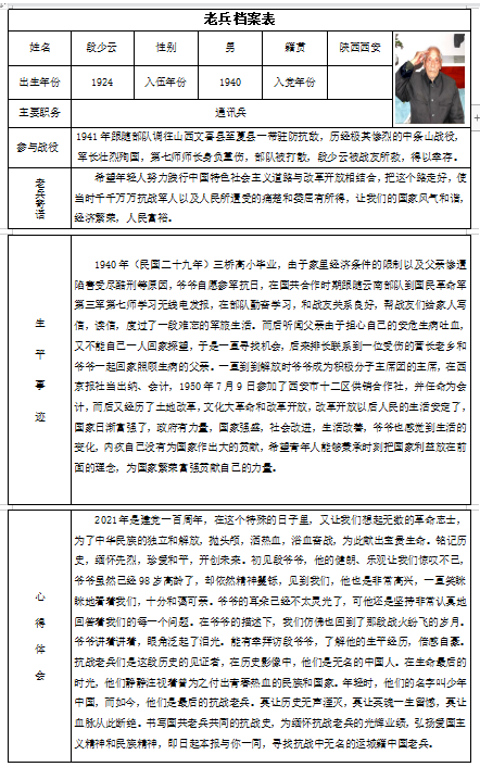 当日活动结束,由团队成员整理编写《老兵档案集》,详细记录了老兵的基本情况以及生平事迹。设置了“老兵寄语”与“心得体会”两个板块,在生活实践中育人,在志愿服务中育人,以抗战老兵的鲜活生动的事例为主体,在青少年当中开展理想信念教育和爱国主义教育,使青少年牢固树立远大理想,传承中华民族优良品格。