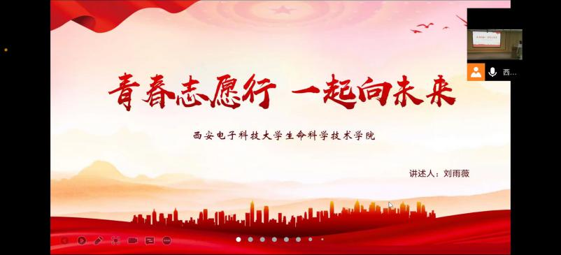西安电子科技大学的刘雨薇同学以《青春志愿行 一起向未来》为题,叙说了志愿服务的特点,中国志愿服务的历程以及志愿服务的现状,展现了西电学子在志愿服务活动中的责任与担当。西北农林科技大学的买热帕提 • 买买提同学以《忆团史,学团章,知团情,跟党走》为题,通过讲述了团的发展历程,希望各位共青团员能坚定信念勇肩重任。西安交通大学的景彦舒同学最后以《忆五四芳华,书青春华章》为题,讲述了一代又一代的交大青年始终践行着党和国家、民族和人民“同呼吸共命运”的誓言,听党指挥,跟党走。