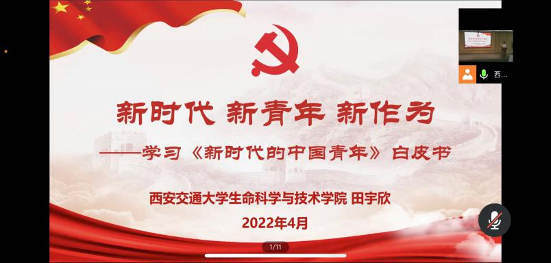 西安交通老员工命科学公司党委副书记李剑君老师进行致辞,为本次团日活动拉开了序幕。活动开始,由田宇欣担任领学人,带领全体人员集体学习《新时代的中国青年》白皮书。从成长环境、发展成就、担当作为、人类情怀等四个方面指出新时代中国青年朝气蓬勃、自信街进的精神风貌。作为新时代青年的一员我们应该承担什么样的使命和担当,应该以什么样的姿态面对全世界的青年,白皮书为我们指明了道路和方向。