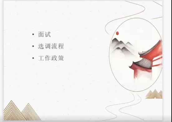 尉衍师姐就陕西选调的考录流程进行了分享,她着重从面试、选调流程、工作政策三个方面进行了介绍,具体地介绍了面试内容、面试流程及注意事项。同时向大家分享了选调后的日常工作,并强调,如果选择选调,就要脚踏实地的干好本职工作,选调路上终将有一方天地属于你我。