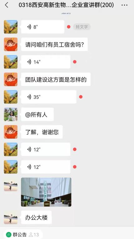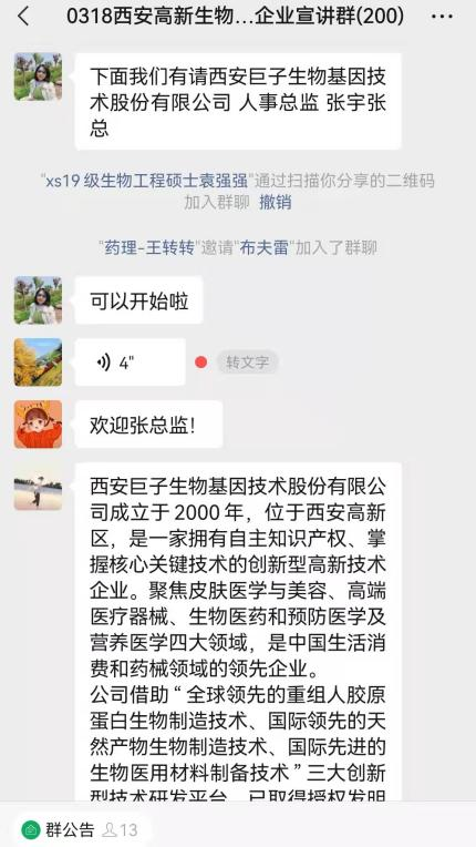 此次专场招聘会作为疫情防控形势下的一次大胆实践,前期通过毕业生就业需求广泛调研,积极联系西安联创并充分交流,利用线上渠道大力宣传,共计邀请了西安高新区8家优质生物医药企业参会,提供覆盖生物工程、细胞生物学、动物学、生物化学与分子生物学、中药学等若干学科对口岗位39个,拟招聘人员127人,充分满足了公司生物类、中药类员工的求职需求。宣讲群内采用各企业负责人分时段入群,首先介绍公司简况、工作内容、岗位需求以及招聘相关事宜,随后毕业生与企业问答互动的方式进行,毕业生们根据个人诉求积极提问,深入了解了职位信息、企业文化、福利待遇等问题。