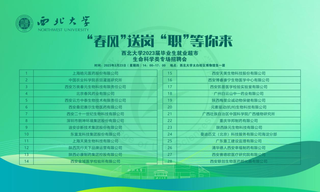 为深入贯彻落实党中央、国务院“稳就业”“保就业”决策部署,进一步推进2023届毕业生就业创业工作,更好搭建用人单位与毕业生高效供需平台,促进毕业生更充分更高质量就业,3月23日下午,由校员工就业创业指导服务中心主办,公司承办,西安联创生物医药孵化器协办的2023届毕业生就业超市——生命科学类春季专场招聘会在太白校区博物馆如期举办。公司党委常委、副董事长,学部主任陈富林出席并走访参会单位,员工工作部部长寇嘉、校就创中心副主任米鑫、公司党委负责人张宇、经理付爱根、员工工作负责人魏宁、就业专干、全体学工干部陪同走访。公司2023届百余名毕业生,西北农林科技老员工命科学公司等兄弟院校毕业生参加招聘会。