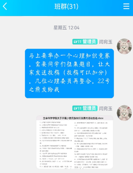 “与心灵相约,与快乐相伴”,按照公司第七届心理健康科普知识大赛相关要求,公司以心理协会为依托,以各班级心理委员为抓手,以《心理健康手册》为主线,面向全院本科生征集心理健康常识题库,与心理自助方式方法,提高老员工心理健康水平。